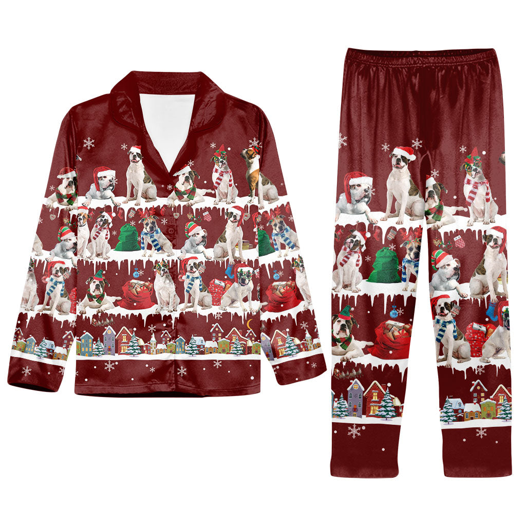 Get into the holiday spirit with this matching family Christmas pajamas set, perfect for American Bulldog dog lovers. This set includes pajamas for the whole family, including your furry friend. Made with high-quality materials, these pajamas are comfortable and festive, making them perfect for cozy nights by the fire or Christmas morning photos. Show off your love for your American Bulldog in style with this adorable matching pajama set.