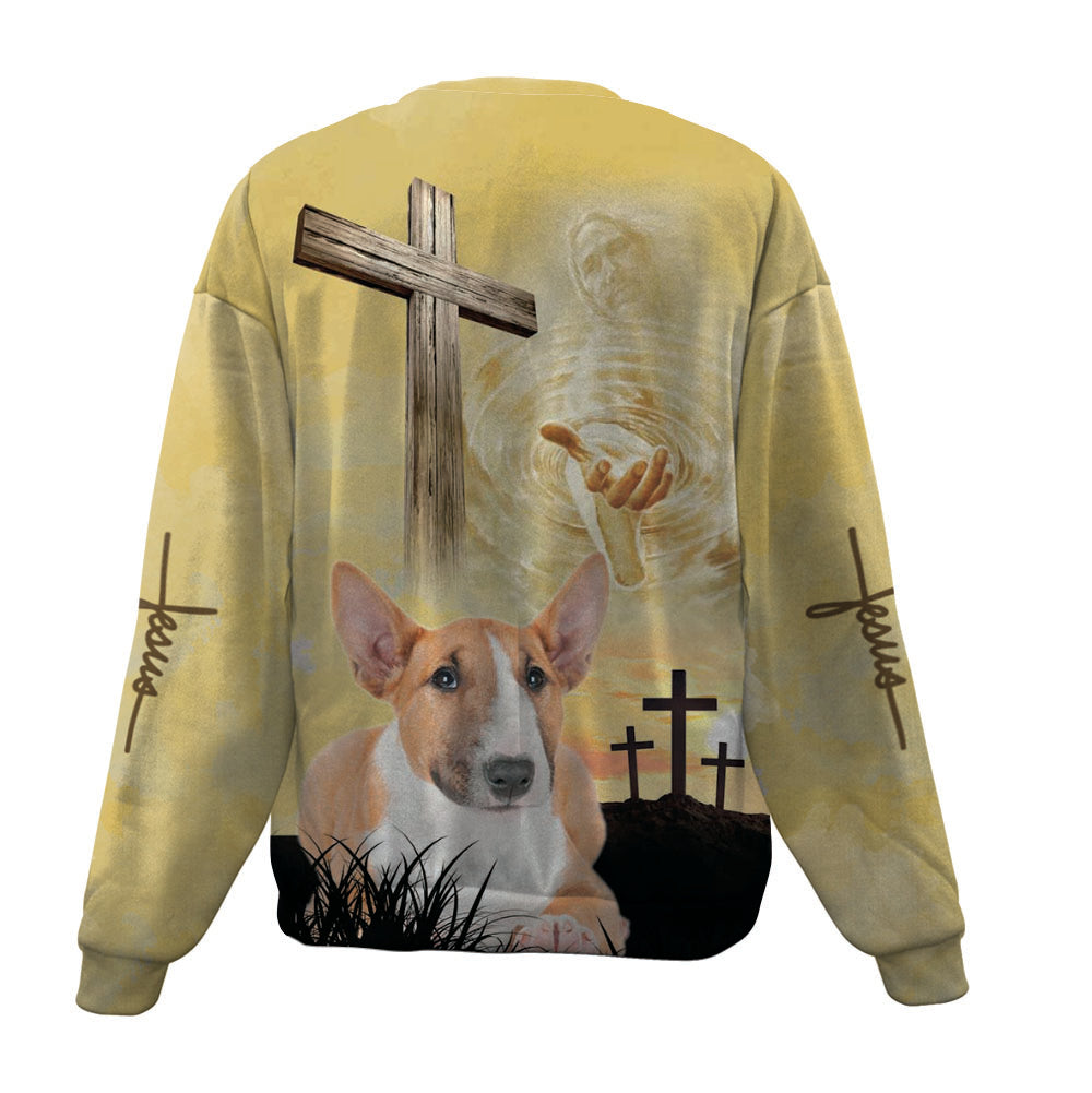 Featuring a detailed design of a Bull Terrier with a Jesus motif, this sweater is perfect for casual outings, dog park visits, or simply lounging at home. Available in various sizes, it caters to all body types, providing a perfect fit for everyone.
