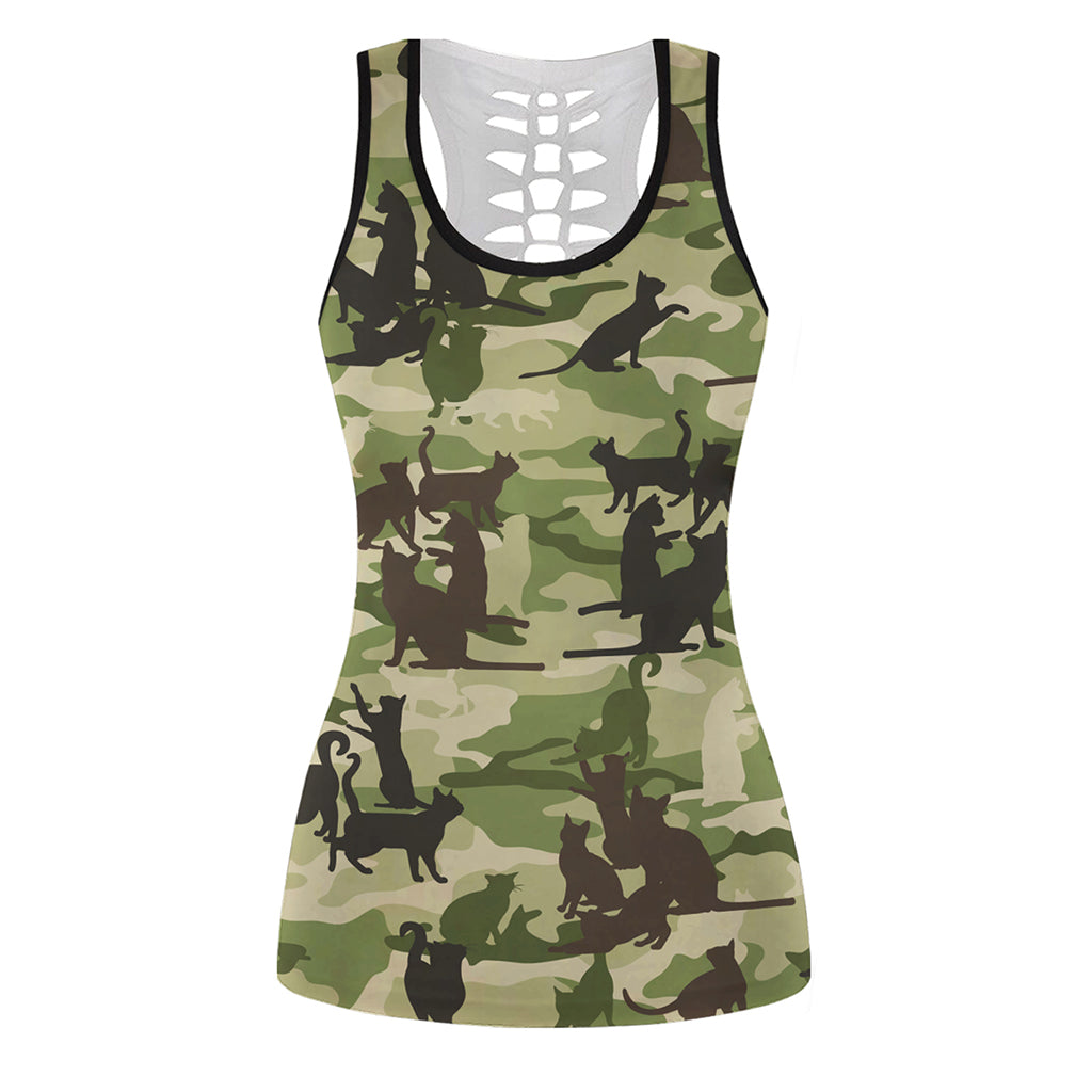 This Cat Camo Combo Hollow Tanktop + Legging set is perfect for those who love a unique and stylish look. The tanktop features a camouflage print with a cute cat design, while the leggings have a matching camo pattern. The hollow design adds a trendy touch to the outfit. Made from comfortable and stretchy material, this set is great for workouts or casual wear. Stand out from the crowd with this fun and fashionable combo!