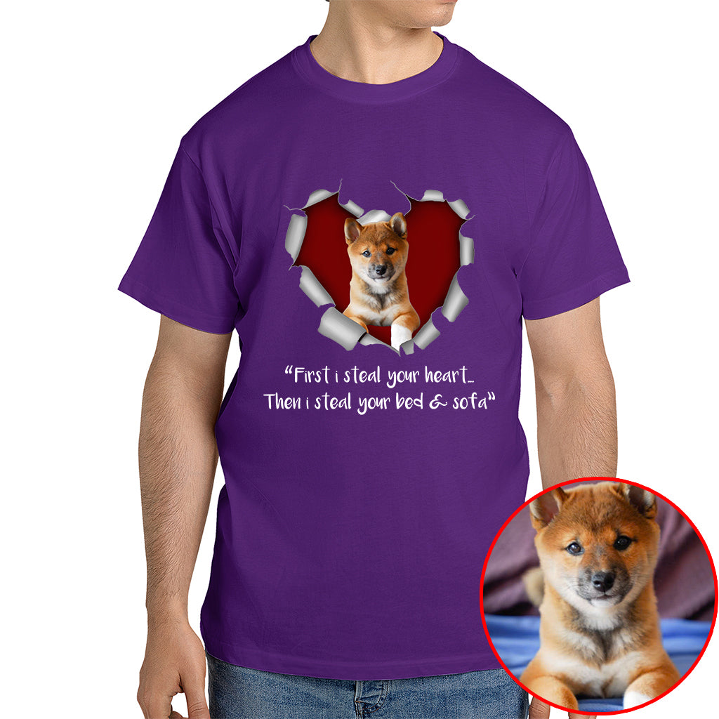 Your furry friend is the ultimate home invader! Show off your dog's mischievous side with our hilarious 'First I Steal Your Heart, Then Your Bed & Sofa' pet photo t-shirt. Customize it with your pup's cutest or silliest face.