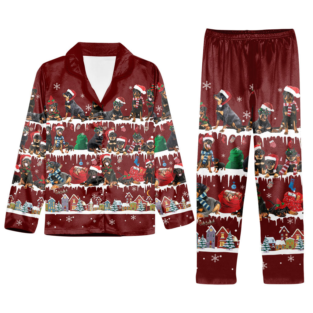 Get your whole family in the holiday spirit with these matching Christmas pajamas set designed for Rottweiler dog lovers. This set includes pajamas for adults, children, and even your furry friend, so everyone can join in on the festive fun. Made with soft and comfortable materials, these pajamas are perfect for cozy nights by the fire or opening presents on Christmas morning. Celebrate the season in style with this adorable matching family pajama set.