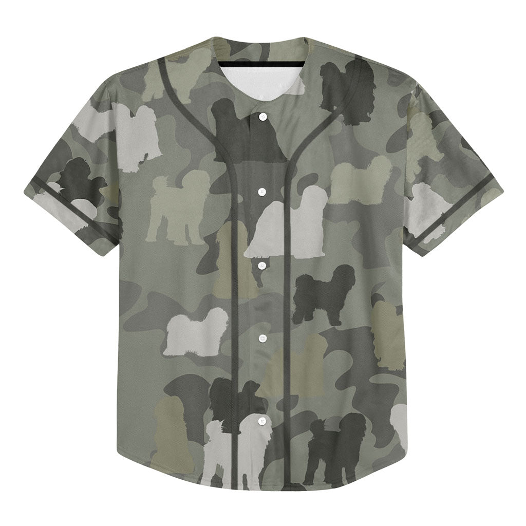 Show off your love for dogs with this Tibetan Terrier Camouflage Baseball Jersey! This unique camo pattern dog shirt features adorable Tibetan Terriers blended into the design. Perfect for dog lovers who want to stand out in style. Made with high-quality materials, this baseball jersey is comfortable and stylish. Get yours today and show your love for dogs wherever you go!